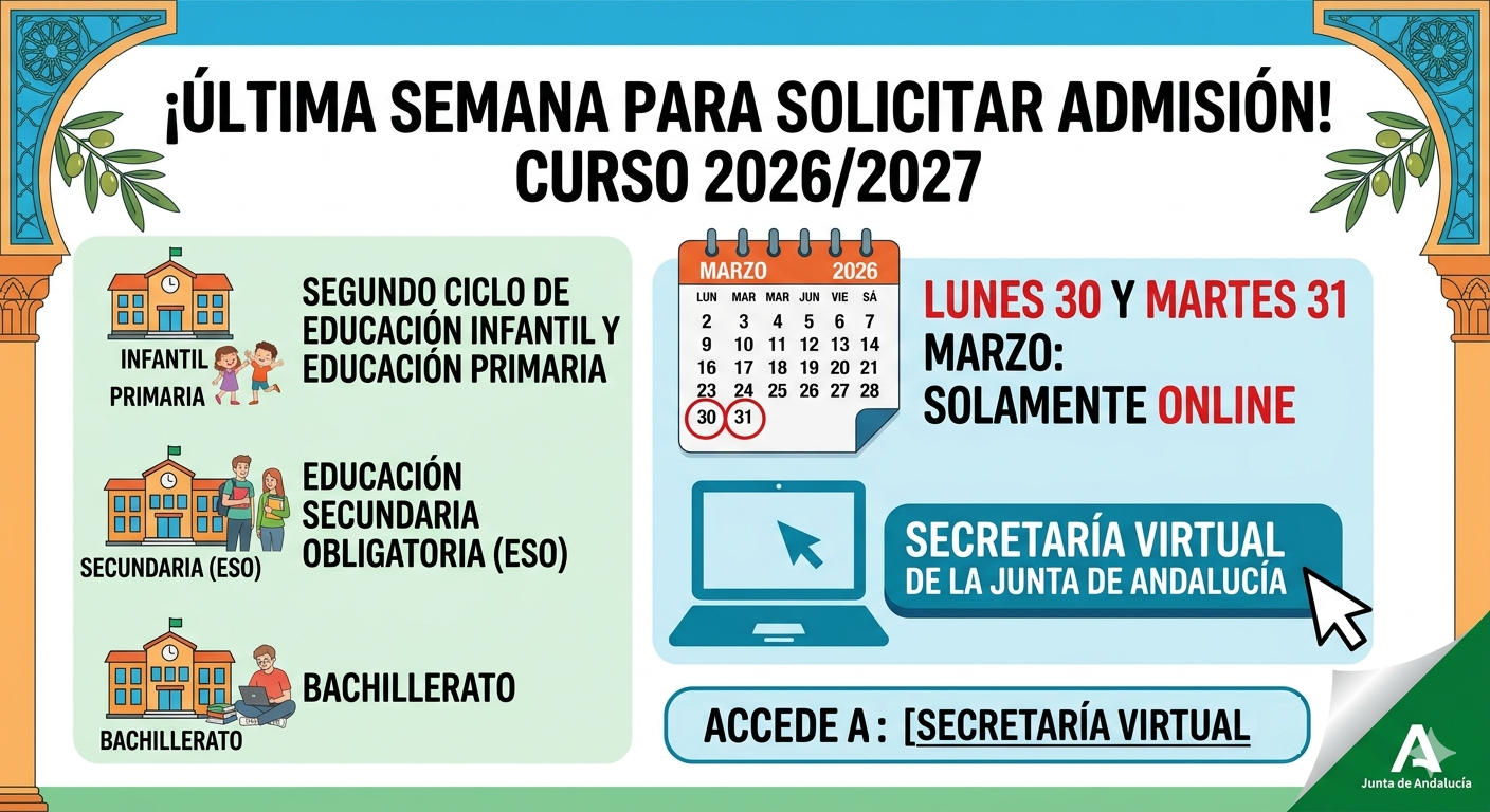 Os recordamos que esta es la última semana para solicitar la admisión en centros docentes públicos para cursar las Enseñanzas de Segundo Ciclo de Educación Infantil, Educación Primaria, Educación Secundaria Obligatoria y Bachillerato para el curso escolar 2026/2027. El lunes 30 y martes 31, solamente podréis hacerlo a través de la secretaría virtual de la Junta de Andalución.